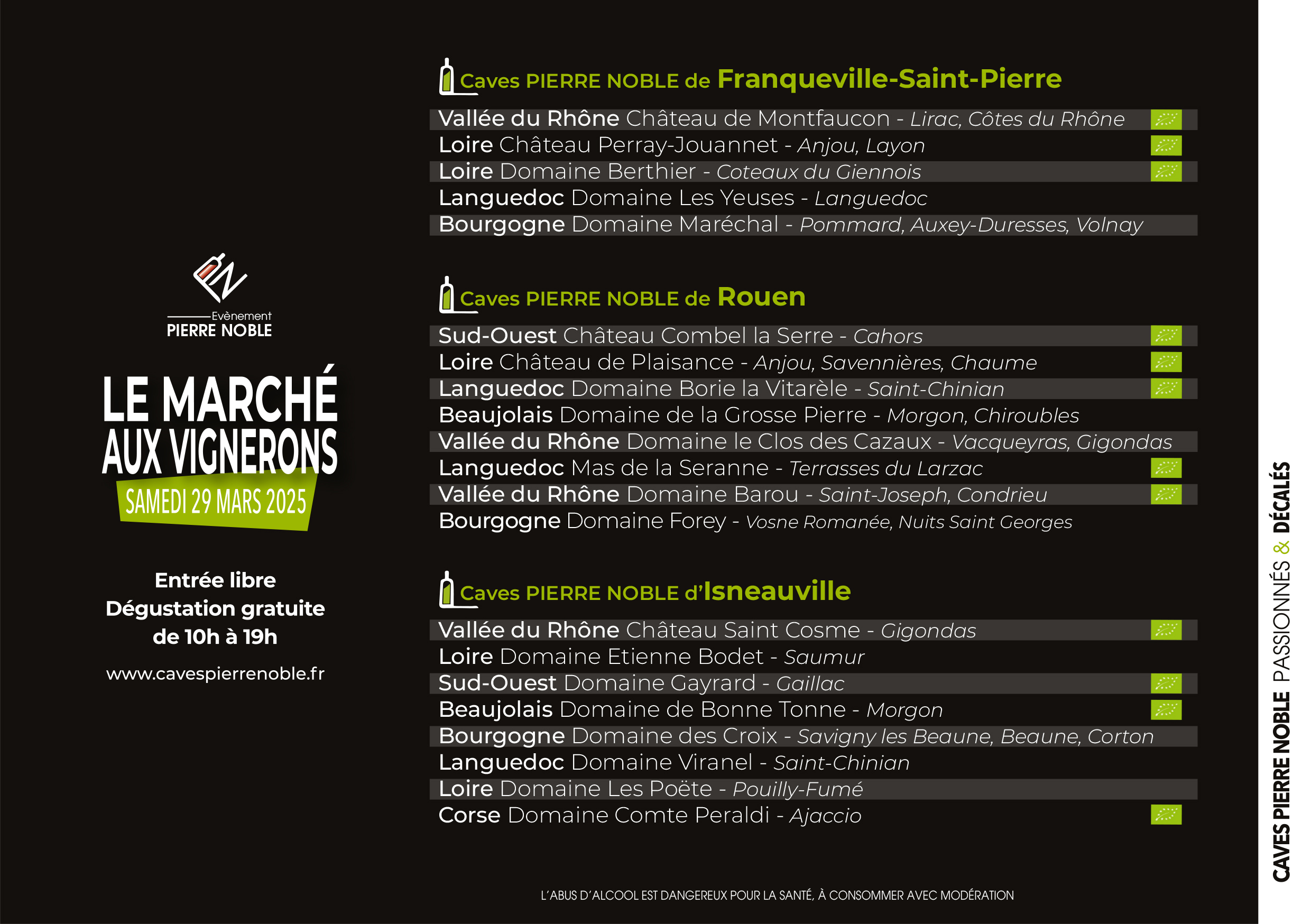 Jean-Baptiste Boirin2025-04-08T11:03:36+02:00Les Caves Pierre Noble sont heureuses de vous inviter à notre 21ème Marché aux Vignerons, un événement incontournable pour tous les amateurs de vin et les passionnés de gastronomie. Rejoignez-nous pour une journée exceptionnelle dédiée à la découverte des meilleurs crus et à la célébration de l'art de la viticulture. Au menu rencontre avec nos vignerons dans nos 3 Caves de Rouen, Isneauville & Franqueville Saint-Pierre.